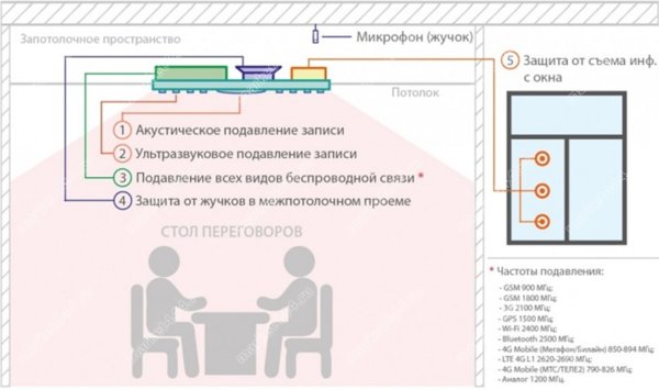 Потолочный подавитель микрофонов гарантирует полную конфиденциальность информации!
